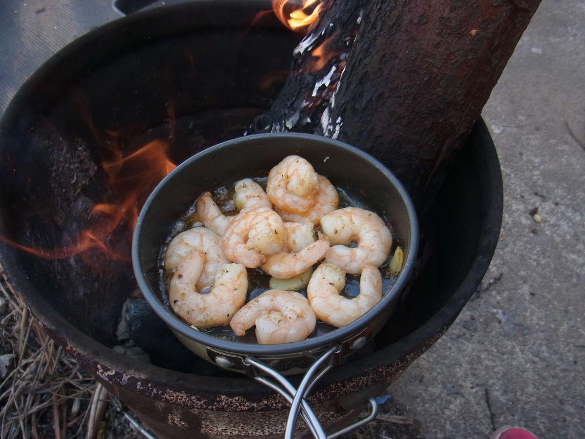しかも、テーブルやBBQコンロを出してくるのも面倒くさくて、家にあった丈夫な缶に近所のお宮から拾ってきた木を入れて火を着け、網を乗っけただけというものぐさぶり。